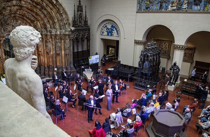В получасовом azione buffa наряду с информационным пластом нашлось место и концертным вставкам – номерам из оперы-сериа Генделя «Альцина». В рамках «проекта» прозвучали увертюра, а также ария Альцины «Ma quando tornerai» (Татьяна Ханенко) и ария Морганы «Tornami a vagheggiar» (Альбина Файрузова). И вышло всё это здóрово – весело, иронично, креативно, музыкально ярко, но при этом «довольно серьезно». А как же иначе! Подход к качественно веселому перформансу просто обязан быть серьезным! Взяв это на вооружение и воплотив идею директора ГМИИ им. А.С. Пушкина Марины Лошак, пригласившей Фестиваль «Видеть музыку» в храм искусства, открытый как музыке, так и театру, автор-режиссер перформанса Георгий Исаакян интегрировал в действо фрагменты спектакля «Репетиция оркестра», поставленного им в Детском музыкальном театре.