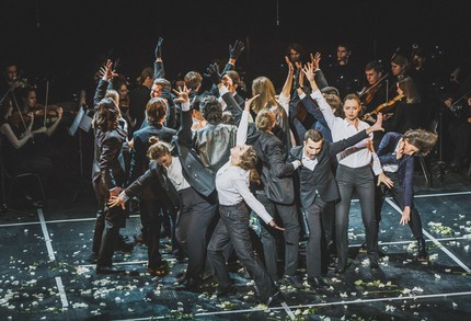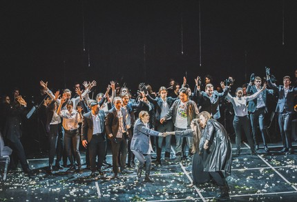 И вопреки априорному скепсису рецензента, именно музыкальная сторона постановки более чем приятно удивила, хотя из пятерки сольных персонажей тройка мужских голосов, увы, разочаровала. Подлинным же открытием стали женские голоса главной пары героев – Ромео (героя-травести, поющего тембром меццо-сопрано) и Джульетты (героини-сопрано). Однако о певцах-солистах – позже, а пока лишь скажем, что постановка нашла потрясающе надежную – и это также приятно удивило – коллективную опору на оркестр и хор. В этом проекте свои усилия вдохновенно объединили оркестр «Новая Москва» (художественный руководитель коллектива и дирижер-постановщик спектакля – Даяна Гофман), вокальный ансамбль «Arielle» (художественный руководитель коллектива и главный хормейстер проекта – Эльмира Дадашева), артисты Хора Театра им. Н.И. Сац, а также студенты ГИТИСа (мастерская Георгия Исаакяна) и небольшая группа миманса.