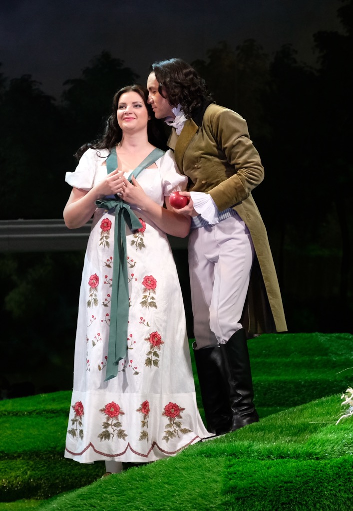 Весь ансамбль певцов – прекрасные артисты, и при крупноплановой подаче их игры на трансляционном экране это видно особенно отчетливо. Специфически харáктерная партия Дормона невелика, однако в контексте ее задач тенор Руслан Совет вызывает в ней полное доверие. Джермано – герой особый, персонаж buffo, и коль скоро он слуга у Дормона, то его так и хочется назвать персонажем служебным. Но это совсем не так: он очень важный винтик сюжета, и это видно еще с интродукции, плавно переходящей в его дуэт с Джулией, а перед финалом у Джермано даже есть своя законная ария! И в этой благодатной партии баритон Азамат Желтыргузов необычайно органичен и как актер, и как певец.