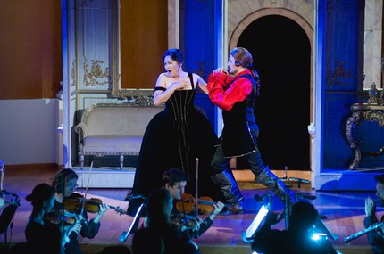 В результате им удалось создать прелестный карнавальный спектакль в semi-stage формате, который для эстетики комического фарса оказался абсолютно самодостаточным. Уже сам декоративный антураж сцены Камерного зала в форме подиума, у которого нет кулис, но есть проход в центре вогнутого задника и подъемы-проходы с обоих флангов, абсолютно дружествен для создания на этой сцене постановок подобного камерного толка. Оркестровой ямы в Камерном зале нет, однако это не беда: небольшой по составу оркестр вполне органично вписался в зазор между подиумом и первым рядом зрительских кресел.