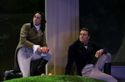 Тембрально насыщенное, динамично бойкое воплощение образа Ольги удалось меццо-сопрано Оксане Давыденко, а в партии Ленского подлинно ярким открытием стал Нуржан Бажекенов, лирический тенор, необычайно тонко прочувствовавший и стиль этой музыки, и поэтический образ своего персонажа. Прекрасная работа, и большая романтическая ария Ленского в эмоционально пронзительной трактовке певца, взявшего в плен живой правдой чувственной кантилены, убедительно это доказала! Благородством артистической манеры, предельно точно расставленными интонационными акцентами, психологической глубиной образа титульного героя властно захватил баритон Андрей Трегубенко. Ему лишь немного не хватило пластичности и свободы вокальной линии: она оказалась чуть зажатой. Но к чести исполнителя, он предстал истинным музыкантом: не форсируя звукоизвлечение, он оставался вдумчивым интерпретатором и в сцене отповеди Татьяны, и в большой «арии возвращения» Онегина, и в финальной сцене оперы. Что ж, при наличии таких артистов в главной тройке сопрано, тенора и баритона опера Чайковского, однозначно, состоялась!