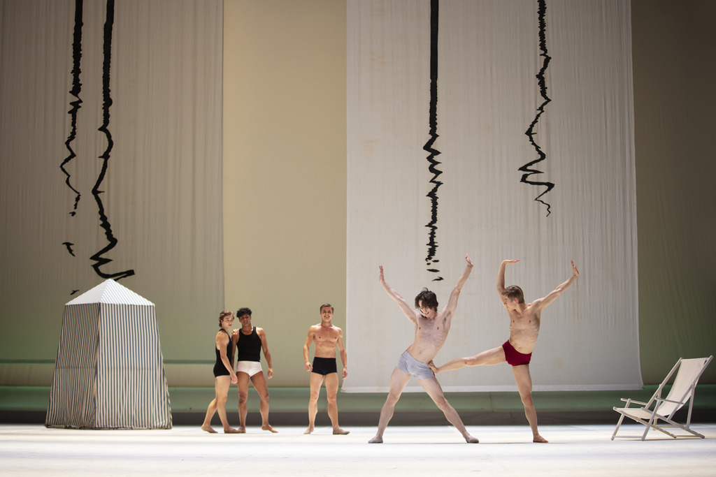 В аскетичных декорациях сдержанно двигаются элегантные дамы и господа, время от времени пары ссорятся между собой; играют мускулами парни на венецианском пляже.