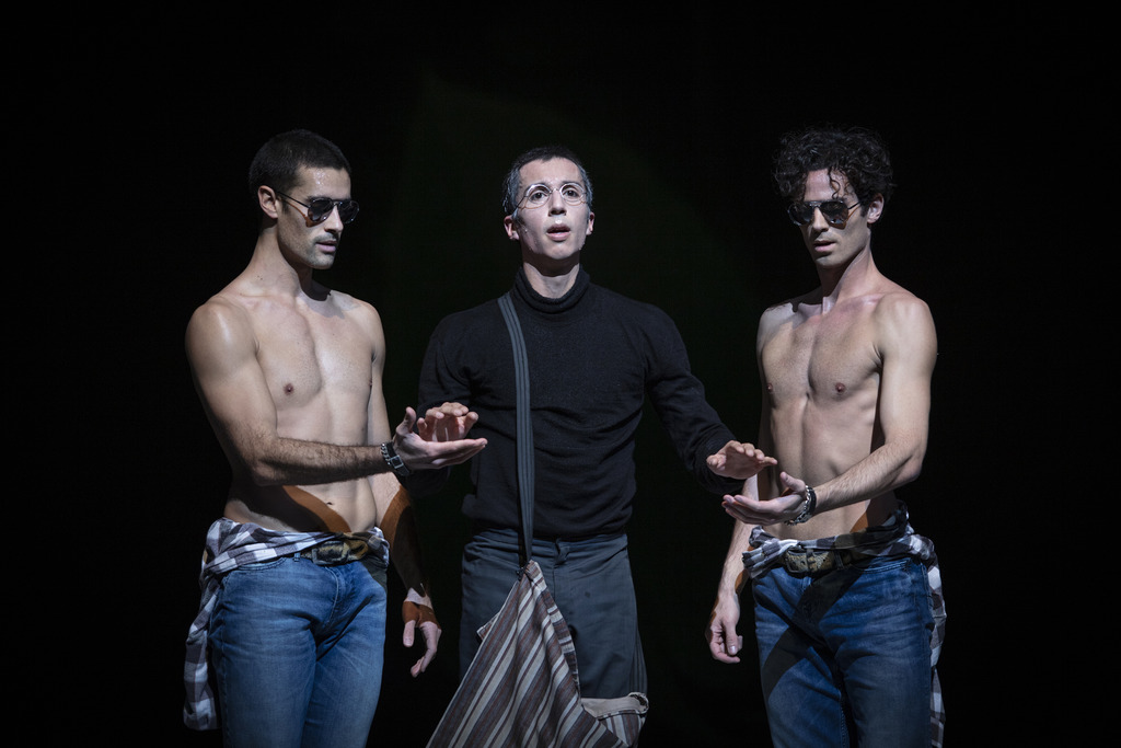 На протяжении новеллы Ашенбах встречает ряд символически нагруженных персонажей: это странник в Мюнхене, молодящийся старик, гондольер без патента, гитарист-виртуоз, цирюльник, превращающий Ашенбаха в молодящегося старика. Всех их Ноймайер удваивает: Марк Юбете и Феликс Пакет появляются то в джинсах с обнаженными торсами, то пляшут в рыжих париках с раскрашенными губами.