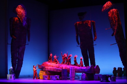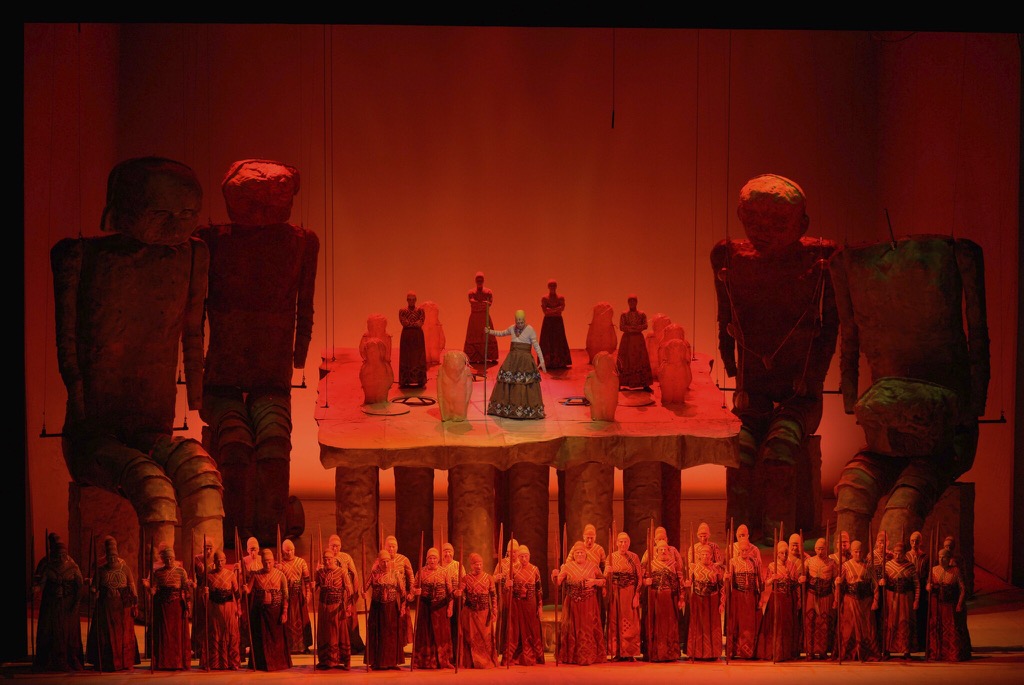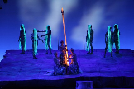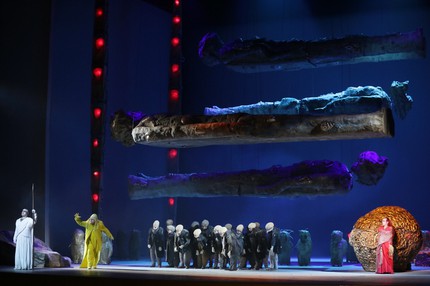 Его сценическое решение определилось не сразу. Первые две оперы цикла поставили немцы Готфрид Пильц и Йоханнес Шааф, но от их концепции театр отказался, и теперь все «Кольцо нибелунга» объединено пластическим замыслом знаменитого российско-американского художника и дизайнера Георгия Цыпина. Он задал постановке космический масштаб и вневременные координаты, вернув творение Вагнера в пространство мифа. Главный образ, придуманный Цыпиным, — слюдяные гиганты, великаны, похожие на истуканов с капища. Они молчаливо созерцают драму богов, валькирий и земных существ. Театральный художник Татьяна Ногинова соединила в костюмах греческие хламиды, римские тоги, татуировки самураев и перья ирокезов, а художник по свету Глеб Фильштинский создал изощренную световую партитуру, которая чутко реагирует на события в оркестре.