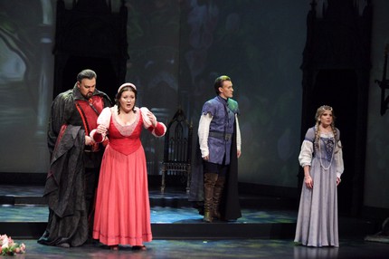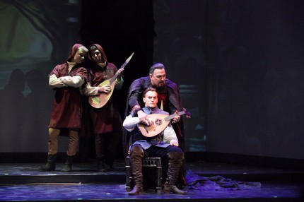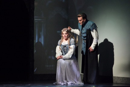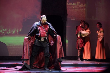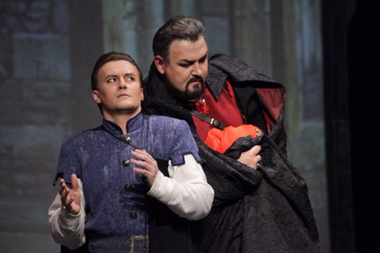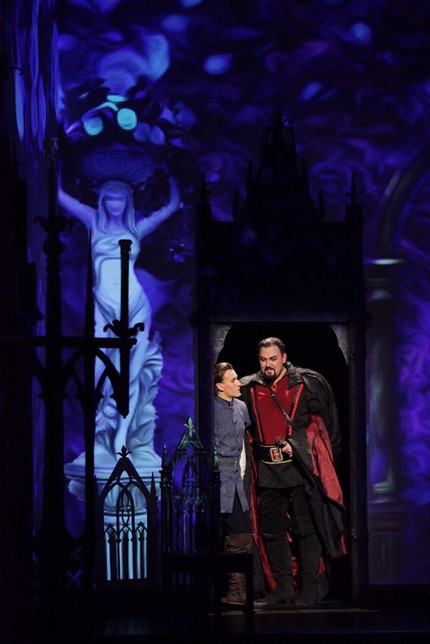 Сценография спектакля – огромная трехсторонняя «коробка», доходящая «бортами» до колосников сцены и открытая четвертой стороной залу. «Коробка» снабжена четырьмя готическими дверными порталами: два – на заднике, и по одному – на флангах кулис. Внутри «коробки» – минимальный сценографический реквизит также в готическом стиле: столы, стулья, огромные канделябры и прочее. Объемная реалистичность сценографии каждой картины создается видеопроекциями сразу на три стороны, и это, в сочетании с реальными контурами, складывается в один визуальный эффект, рождающий «рельефно-выпуклые» театральные картины – как интерьерные, так и экстерьерные. Как всё просто и как при этом волшебно! Сегодня режиссерско-сценографические «заумствования» стали настолько общим проблемным местом музыкального театра, что когда сталкиваешься с чистой «классикой жанра», решенной такими простыми, но эффектными средствами, на сердце становится легко и светло, несмотря даже на всю трагедию сюжетной коллизии…