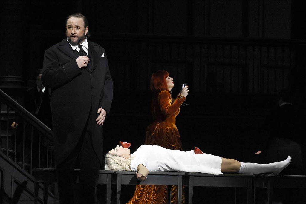В режиссерскую эстетику Клауса Гута Асмик Григорян как певица-актриса вписалась как нельзя лучше, а титульная партия в этой опере – всё! Но даже при всей сюжетной важности партий Ирода, Иродиады и, конечно же, Иоканаана, все они по отношению к партии Саломеи являются прикладными. Это вовсе не значит, что к кастингу на них можно отнестись легкомысленно, и в серьезности намерений постановки Большого театра на сей счет сомневаться не приходится. В партии Ирода выступил немецкий тенор Винсент Вольфштайнер, в партии Иродиады – итальянская меццо-сопрано Анна Мария Кьюри, в партии Иоканаана – немецкий баритон Томас Йоханнес Майер. Это всё работы добротные, довольно яркие, запоминающиеся, а в качестве совсем уж эпизодических, вспомогательных персонажей также на позитиве отметим тенора Илью Селиванова в партии смертельно влюбленного в Саломею Нарработа и Алину Черташ в партии-травести Пажа Иродиады.