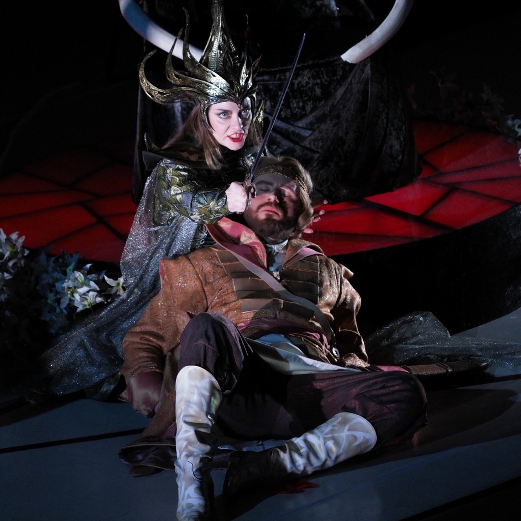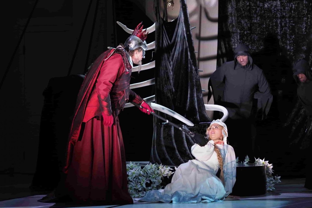 К тому же порадуют работы солистов, здесь каждый хорош по-своему. Конечно, под номером первым — неистовый страстный Кащей с позолоченным черепом (Михаил Агафонов), твердо уверовавший в бессмертие и вдруг уловивший намек на свой конец, его посланник — стихийный Буря-богатырь Андрея Триллера, былинный русский витязь Алексея Шаповалова. И женские персонажи-противоположности: теплая и игривая, едва ли не издевающаяся над бессмертным Царевна-Краса (Дарья Шувалова) и брутальная, с вагнеровским отсветом на челе и с мечом в руке Кащеевна (Марина Кипинган). Жаль только, что главный хит оперы — ария с ковкой меча не удается ей в полной мере, не высвечивает яркие эффектные кульминации.