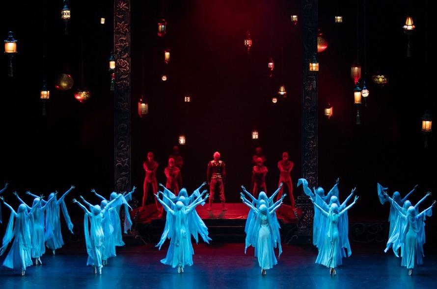Ну, а такая музыка рождает соответствующую ей хореографию. А хореография спектакля очень сложна для всех его участников, особенно для исполнителей ведущих и сольных партий, а их в балете целых тринадцать! Эльдар Алиев, уроженец Баку, неоднократно ставил этот балет в разных театрах Америки и Европы, однако для труппы Приморской сцены создал новую редакцию. Основа пластического языка персонажей — неоклассика, а для точной передачи стилистики Востока с исполнителями работал специалист по восточным танцам. Дуэты ведущих солистов насыщены сложнейшими верховыми поддержками (например, солист держит балерину, подняв её над головой на одной руке, а она, вытянувшись в струнку почти горизонтально, упирается своей рукой ему в плечо), вариациями и многими элементами, требующими виртуозного исполнения. В массовых сценах занята вся труппа, которая насчитывает около 90 человек.