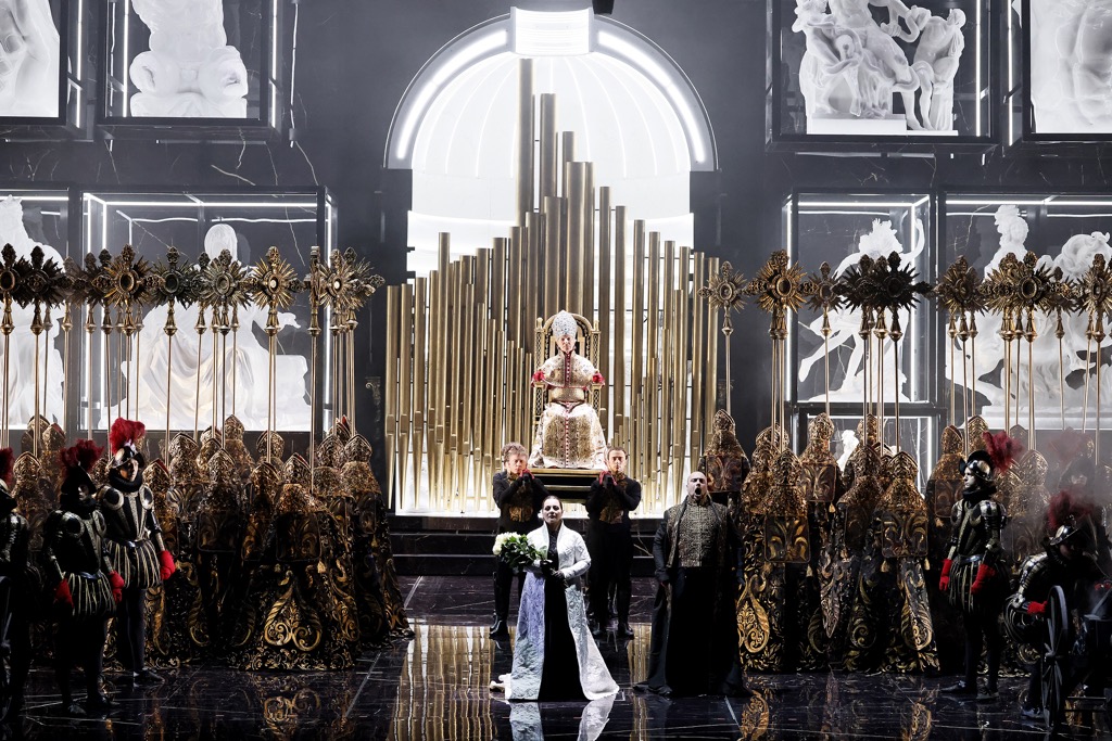 Первый акт – «интерьер» Базилики Сант-Андреа-делла-Валле, обозначаемой подобием часовни с характерным для этого храма куполом со шпилем, но этого вполне достаточно. Понятно, мы – в Риме, точнее – внутри музейной матрицы его знаменитых скульптурных шедевров: они помещены в стеклянные витрины, а часть их для масштабности восприятия растиражирована. Импровизированная часовня – один из экспонатов музея, но для оперной трагедии, в финале которой в стане главных героев окажется три трупа, конкретика храма, где локализованы события первого акта, не столь уж и важна, и с открытием занавеса спиралевидные, витые колонны сценической часовни, как у балдахина Бернини (да, к тому же, похожая форма ее купола), моментально рождают красивую ассоциацию с главным храмом Рима – Базиликой Святого Петра. Слово «интерьер» ранее было взято в кавычки, так как в римской матрице, которая в оставшихся актах претерпевает лишь позиционные изменения своих элементов, грань между интерьером и экстерьером практически стерта.