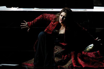 А образ Лианны Арутюнян – штамп совсем из другой оперы, скульптура без жизни и вдохновения, не откликающаяся на движения резца режиссера-скульптора, и оживить ее не по силам даже богине Афродите! Перед нами – не знаменитая, согласно сюжету, певица, а субретка-простушка, весьма упрощенный эрзац, далекий от сферы эстетической категории, которая в данном случае чрезвычайно важна, но дыхание которой в образе главной героини не ощущается совсем. На этот раз Стефано Пода выступает триединым архистратигом – режиссером, сценографом и дизайнером костюмов (он же и художник по свету), но при одном и том же сценографическом антураже рисунки мизансцен обеих исполнительниц разнятся, как «лед и пламень». Динара Алиева – певица-«огонь», творческий потенциал которой стал находкой для режиссера-дизайнера. При внимательном сравнении видно, что ее сценический костюм он скроил по особому лекалу, отчего визуальный шарм стал более «графичным», а страстность и нежность артистической натуры певицы – более рельефной.