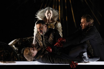 Итак, в начале оперы Анджелотти бежит из Замка Святого Ангела и прячется в Сант-Андреа-делла-Валле. Во втором акте в Палаццо Фарнезе со слов Сполетты мы узнаем, что живым в руки полиции беглец не дался. В третьем акте круг сюжета замыкается снова на Замок Святого Ангела, и мы должны поправиться: трупов в этой опере – четыре, просто, с точки зрения театра, один – «виртуальный», «призрачный». Но не следует думать, что из-за сюрреалистической абстракции эта постановка – действо «малонаселенное». Напротив, за счет «добавленной» сцены на балу-приеме у королевы мимический пласт даже расширен. В первом акте, конечно же, никуда не делись ни жанровые сцены с Ризничим и детьми, ни сцена католической службы с кардиналом, певчими, прихожанами, гвардейцами и залпами пушек (эта сцена при сюрреалистической, в целом, концепции спектакля сделана вполне реалистично). В третьем акте на рассвете звучит любовная песнь Пастушка, а сценическую пустоту прелюдии вполне к месту заполняет «мерлезонский балет» швейцарской гвардии.