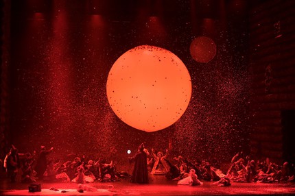 Спектакль Анны Матисон тонко и глубоко эту тему обыгрывает. Нам не показывают разжёванную сюжетную иллюстрацию. Нам не рассказывают, кто хороший, а кто плохой. Нам даже не намекают на место действия, упаковывая происходящее на сцене в как бы узнаваемый инсталляционный антураж чего-то вроде бы славянского, и мы вроде как «узнаём» (блестящая работа сценографа Александра Орлова идеально дополняется световой палитрой, созданной Денисом Солнцевым).