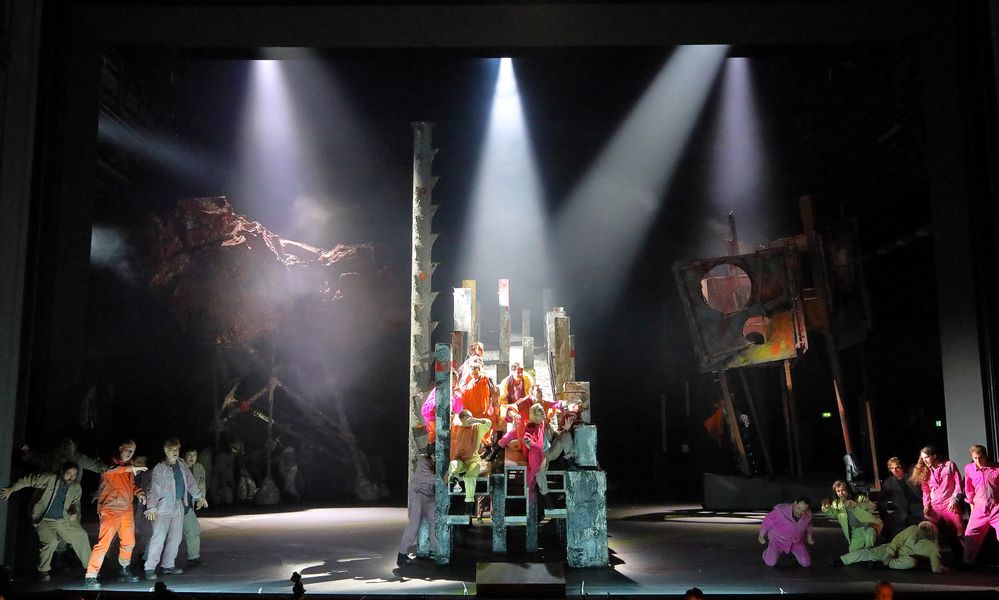 Британская искусстница, или, как написано в Википедии, деятельница искусства, Филлида Барлоу отстаивает в своём творчестве ископаемый квазидадаизм, или, проще говоря, брутально оформленное нагромождение барахла: строительных реек, лесов, булыжников, бытовок, гипсовых фантазий и т.п. хлама. В Мюнхене это любят, поэтому людям со вкусом приходится терпеть. В конце концов, у нас эко-терроризм в моде: зачем что-то выбрасывать, если можно просто отнести на сцену Принцрегенттеатра, верно? Ну это примерно всё, что нужно знать о постановке и о её оформлении.