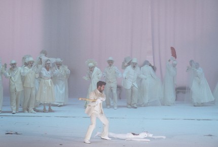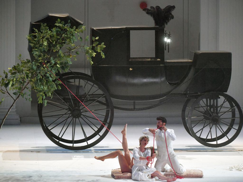 Но есть в спектакле, разумеется, не только локальные символы, как те же серп и молот, будто снятые с герба Австрийской Республики и разделённые между «колхозником» Мазетто и «горожанином» Дон Жуаном, или тот же «упоротый лис», который, будучи талисманом зальцбургских мусорщиков, появляется в свальной вакханалии финала I акта. 4)