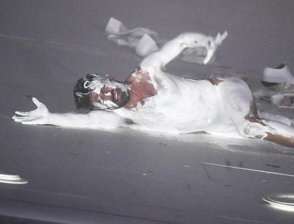 И финальное обездвиживание этого Дон Жуана, превращение его в белую мумию, подобную фигурам, найденным во время раскопок в засыпанных пеплом Помпеях, — самое страшное наказание. Это конвульсивное обесточивание, в котором обнажённый герой покрывается белой краской-известью, превращаясь в безжизненную окостеневшую фигуру, — абсолютно гениальное режиссёрское решение, с которым артист виртуозно справляется, если и не оправдывая своего героя изображением его истошных предсмертных мук, то уж точно канонизируя своим прочтением право живого человека быть в гармонии с самим собой вне зависимости от того, что думают по этому поводу другие.