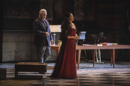 Людовик Тезье в партии Скарпиа прозвучал блестяще: ровно, плотно, стильно, убедительно. Монолог II акта вынужденно дробится из-за бестолковых мизансцен, когда Скарпиа делится с нами своим жизненным кредо на велотренажёре,***) но на голос и игру это не влияет. Играет артист намного лучше, чем в 2018, звучит изумительно, выглядит исключительно. Замечательная работа, одним словом.