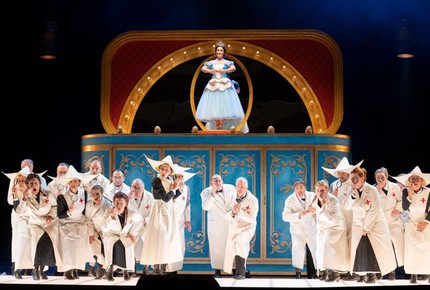 Духи пива и вина, хором открывающие спектакль, появляются в белых халатах с медицинскими крестиками. Можно подумать, что так намекается на вред спиртных напитков для организма и психики Гофмана, но всё не так просто. Этим способом в спектакль вводится тема войны.