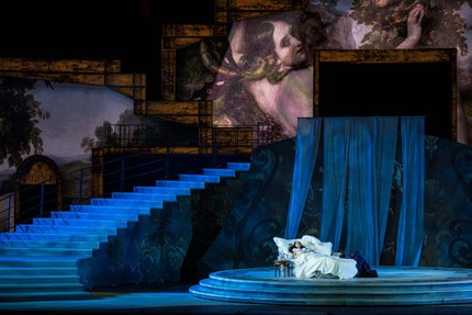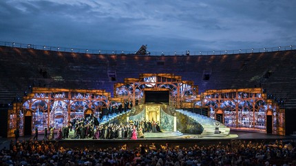 Огромное пространство сцены, визуально разделенное задрапированной бархатом и пышно украшенной аркой, буквально светилось роскошной выделкой декора. Это декоративное раблезианство гипнотизировало. И Арена ди Верона была одним из тех мест, где пытались удерживать оборону этой монументальной сценографической пафосности против современных режоперных упрощений, но covid-19 разрушил и эти бастионы. Вместо огромных декораций на сцене были представлены видеоинсталляции с использованием женских образов из коллекции флорентийской галереи Уффици. Получилось эластично, элегантно, тягуче и певуче. Но та художественная энергия, то электричество между сценой и залом, которое с 1913 г. трогательно отражалось в мерцающем пламени свечей, ушло.