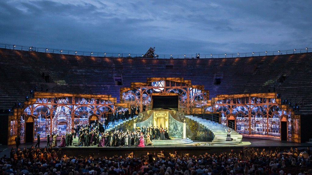 На гигантской Арене ди Верона, в 2 раза менее загруженной в связи с известными событиями, в этот вечер было свежо и ветрено. Последнее в сезоне представление оперы номер один всех времён и народов обещало быть волнительным: из 44 ярусов гигантской Арены было заполнено 30%, прямо напротив меня разместился хор (на сцене его заменял миманс в антиковидных масках), а передо мной сидел один очаровательный дедушка, приведший на спектакль своего, судя по возрасту, внука. Несмотря на устное предупреждение-запрет, публика после 3 звонка зажгла таки свечи (давняя традиция), — и началось…