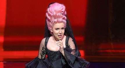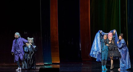 Между тем, несмотря на всю нелепую сценографию из настырного плексигласа и дурашливую пошловатость предложенной драматургии, ядром которой становится бесполое фиолетово-сиреневое дрыгающееся и мельтешащее существо-оживляж [1], я бы оценил новый спектакль как экстремально удачный, прежде всего, из-за блистательного ансамбля солистов и декоративной прелести предложенного режиссёром мизансценного макраме в сочетании с роскошными костюмами Виктории Бэр, прекрасно компенсирующими сценографическую несуразность. Фритч, конечно, сценограф никудышный, но режиссёр всё ещё выдающийся: невероятная живописность пластических характеристик, созданных постановщиком совместно с солистами, зачаровывает и пленяет. Освобождая сцену от малейшего намёка на реквизит, Фритч едва ли не насильно раздвигает рамки сугубо оперных выразительных средств, что в сочетании с экстраординарным мастерством исполнительского ансамбля производит непередаваемое впечатление. И когда вы ощутимо «видите» лестницу у окна, которой на самом деле нет, и перед вами из одной лишь жестикуляции певцов вдруг возникает образ письма, «унесённого ветром», или небольшого кошелька с деньгами, всегда решающими все комические проблемы, не улыбнуться просто невозможно.