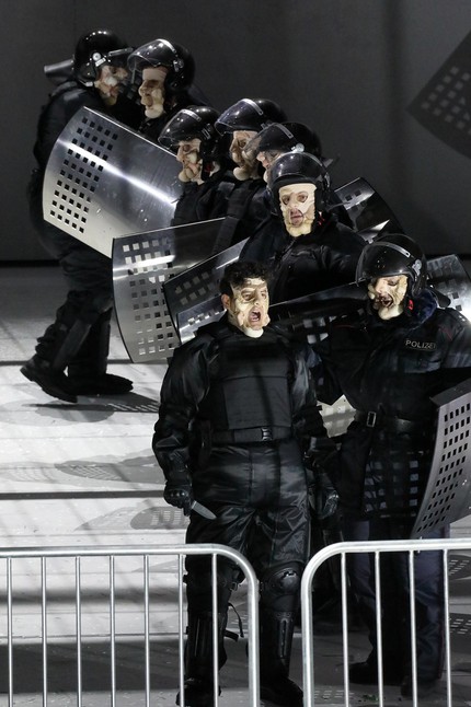 5) На общую концепцию постановки явно повлияло уголовное дело против режиссёра. По этой причине большая часть работы по подготовке спектакля велась невыездным из России Кириллом Серебренниковым в Москве и онлайн. Критика полицейского произвола красной нитью проходит сквозь весь мизансценный и оформительский нарратив постановки.