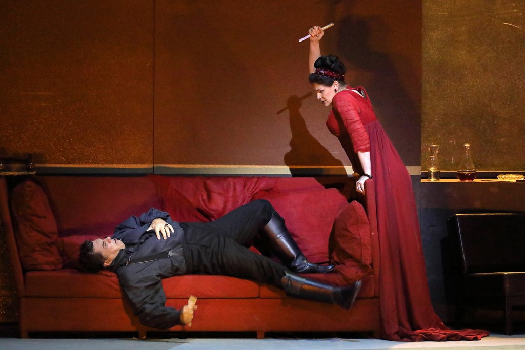 Эту вялую постановку Луки Бонди в Баварской опере я видел в серии премьерных показов 2010 года, и сегодня мне показалось, спектакль уже «отвиселся»: ничто уже не раздражает в сценографии Ричарда Педуцци, в костюмах Милены Канонеро, в мизанценах. И даже когда, зарезав негодяя Скарпиа, Тоска укладывается на кушетку восстановить силы, в душе возникает не протест абсурдностью, а сочувственное умиление: ну всё-таки зарезать такого борова — это вам не голову куропатке открутить; разумеется, после такой нагрузки требуется релакс, да.