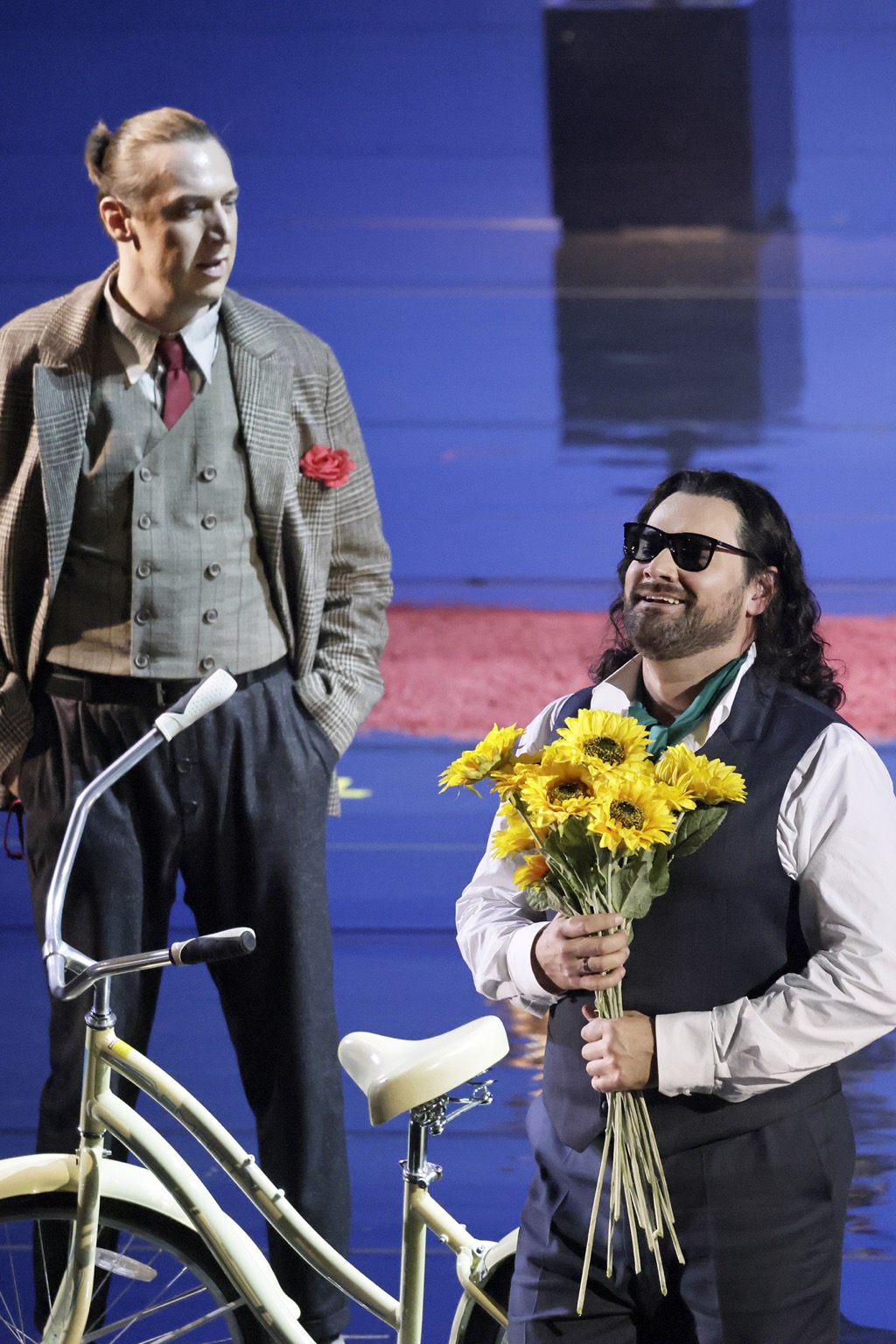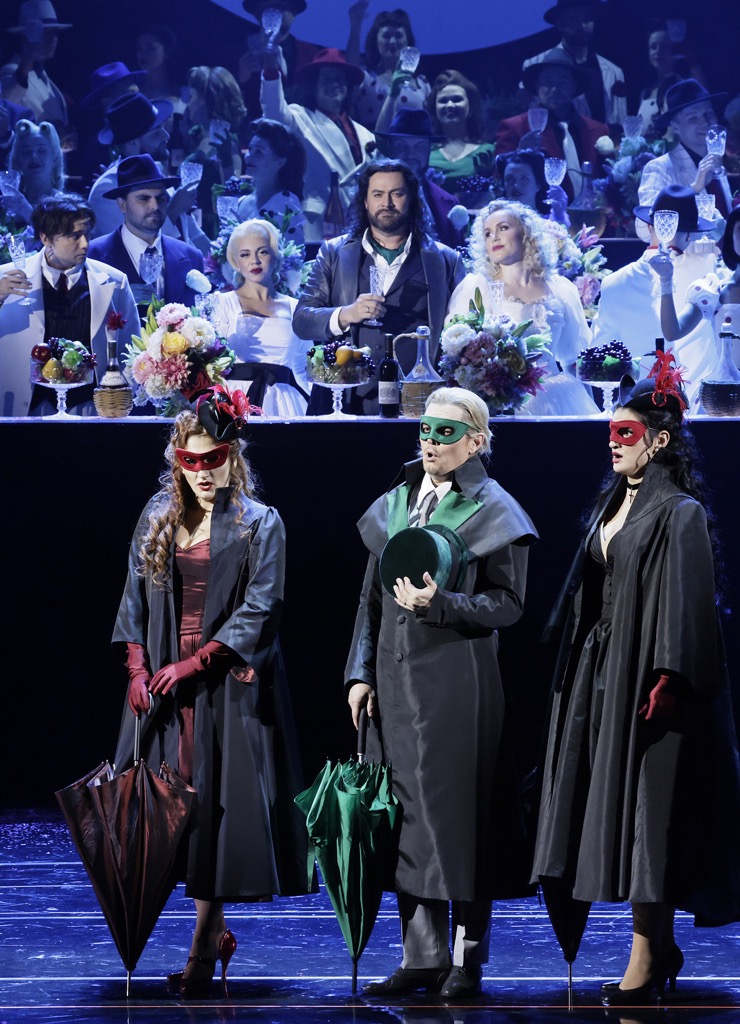 Человеческая комедия, в чём сомневаться не приходится, далеко не всегда весела и беспечна, а зачастую горька и печальна. Да: всё в этом спектакле – игра, основанная на переплетении комедии нравов с комедией положений, но игра настолько достоверная и увлекательная, что втягиваешься в нее удивительно легко, тем более что на режиссерские задумки певцы откликаются также легко – естественно и непринужденно. Визуальная палитра спектакля, сложенная из оттенков черного с вкраплением пятен цвета костюмов, атрибутов и реквизита мрачна и таинственна, но ощущения саспенса, который был бы вряд ли уместен, не возникает. Палитру спектакля художник по свету Дамир Исмагилов словно изнутри наполняет светом оптимизма, а всё действо предельно иронично, но его ирония – не зубастая, а искренне добрая, моралистическая, нацеленная исключительно на позитив.