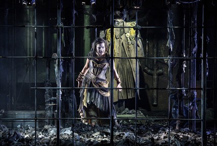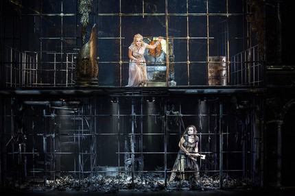 Впрочем, по порядку. На первый взгляд, этажи сценографической клетки, соединенные винтовой лестницей, одинаково мрачны. Но верхний этаж – клетка «золотая», царская, в иные моменты озаряемая светом «праздника жизни», ядовито-яркая аляповатость которого и эпатажно-гротескная передержка костюмов низводят индивидуальность героев (особенно главных) до уровня условных масок итальянской commedia dell’arte, хотя это вовсе не площадное действо, а самая что ни на есть трагедия с деградациями личностей не одного персонажа. Да и на такую экспрессионистическую натуралистичность и расчетливо-сухую педантичность музыкального подхода к этой теме способна лишь немецкая ментальность! Нижний этаж – подвал, помойка, куда загнан затравленный зверек по имени Электра, ведь она в отличие от Хрисофемиды – единственная, кто, выражая открытый протест против подлых убийц своего отца, пытается вести с ними гибридную войну. В нее она настойчиво пытается вовлечь и сестру, которая вовлекаться в бой решительно не желает, за что и получает от Электры по полной…