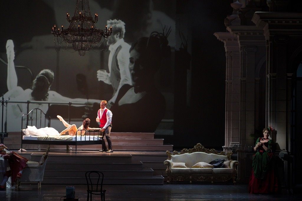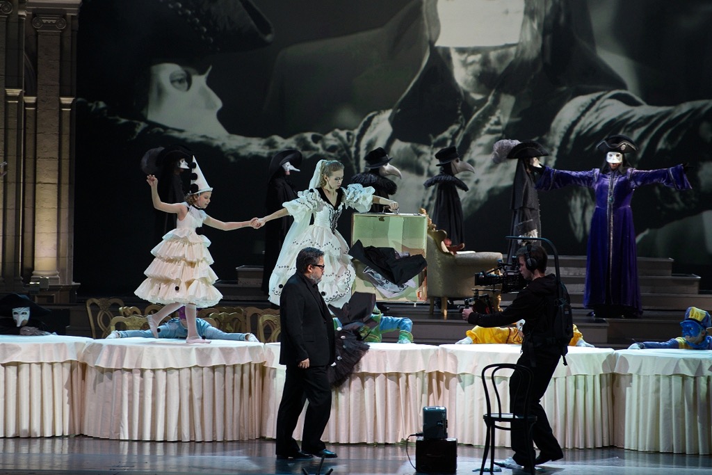 Задник эстетически смотрибельной выгородки с элементами архитектуры классицизма стал киноэкраном, на котором до ряби в глазах непрестанно (!) мельтешили не только компьютерные заготовки, но и черно-белые кадры цветного абсурда, что царил на сцене в реальном времени и был страшно далек от сюжетных ходов либретто, которое режиссер просто положил под сукно. Крупноплановая – и даже эффектная! – картинка на экране от убожества того, что реально происходило на сцене при полном отсутствии выстроенности мизансцен и нарочитом непонимании фундаментальных законов оперной драматургии, как ни крути, ловко отвлекала. Однако и от театра, и, тем более, от оперы этот «гениальный» креатив режиссера также уводил с легкостью! В его авантюру, когда вместо обыгрывания мизансцен актерам нужно было лишь правильно и вовремя занимать свои позиции в кадре, естественно, были вовлечены и беспрестанно снующие операторы с видеокамерами…