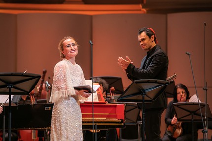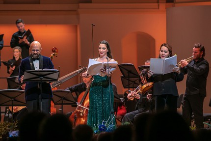 На этот раз речь идет о виртуозной арии di bravura, и в обсуждаемом проекте ее исполнила сопрано Юлия Лежнева. Эта блистательная мастерица барокко, в который раз подтвердив высочайший профессионализм и щедро явив необыкновенную природную музыкальность, взяла на себя партию Галатеи. Кроме сербского бас-баритона Сретена Манойловича в партии Полифема, знакомого нам по генделевскому проекту Уильяма Кристи прошлого года, нынешний состав исполнителей в Москве оказался идентичен составу представления этой оперы на Зальцбургском Троицыном фестивале 2019 года.