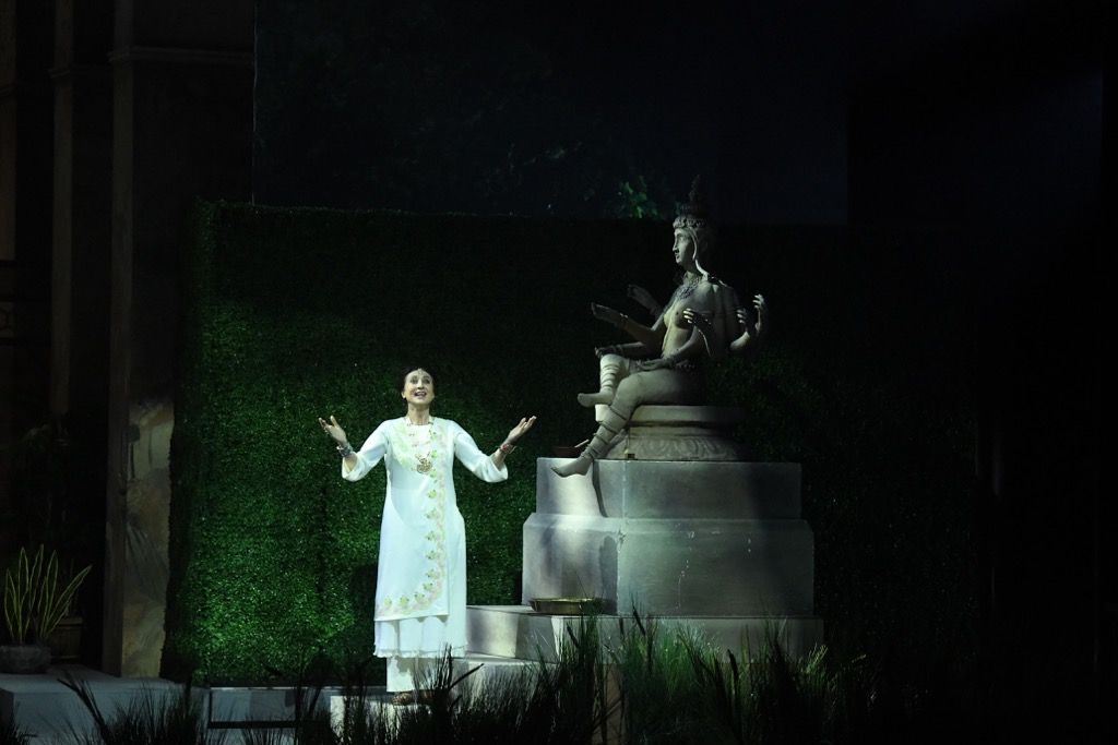 Режиссер сколотил команду единомышленников, в которую вошли Мария Высотская (художник-сценограф, художник по костюмам и гриму), Дмитрий Иванченко (художник-дизайнер видеопроекционной графики), художник по свету Руслан Майоров и хореограф Юлиана Малхасянц. С открытием занавеса перед нами – изумительно зрелищная картина. Перспектива заднего плана – видеопроекционное панно: урбанистический вид с башнями-небоскребами. Передний план – всё живописное пространство сцены, утопающее в зелени насаждений с индуистским храмом и прочими культовыми постройками. В каждом из трех актов сочетание уникальной перспективы города с уникальной локализацией в парковых владениях Нилаканты мастерски волшебно создает непреходящее зрелищное очарование.