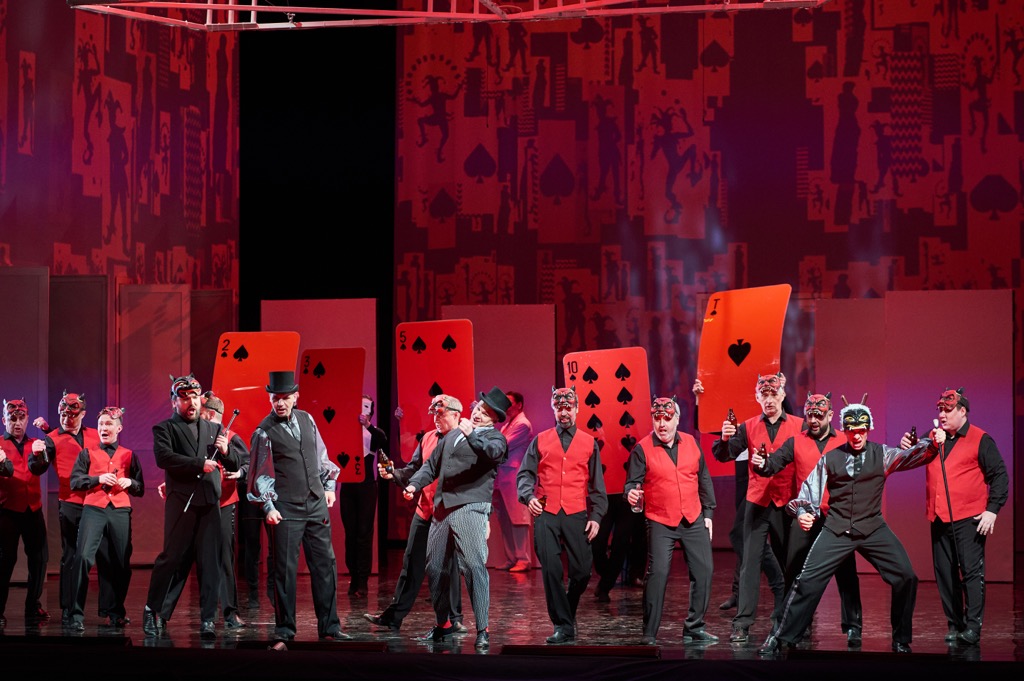 В нынешней игре всего две «масти» – черная и белая, хотя на видеопроекционных экранах мы видим всю карточную палитру. Графиня и Лиза – противоположные сущности черного и белого, словно дублет дамы на игровой стороне карты. Носители белой масти – Лиза, ее подруга Полина и Князь Елецкий (персонаж, проработанный в либретто менее всего). Носители черной масти – Графиня, Герман и Граф Томский, не считая Сурина и Чекалинского, образующих с Томским искушающую Германа явно не святую троицу. Черная масть довлеет надо всем, и белое исподнее, в котором и Графиня, и Герман отходят в вечность, в заблуждение вводить не должно: это всего лишь цвет погребального савана.