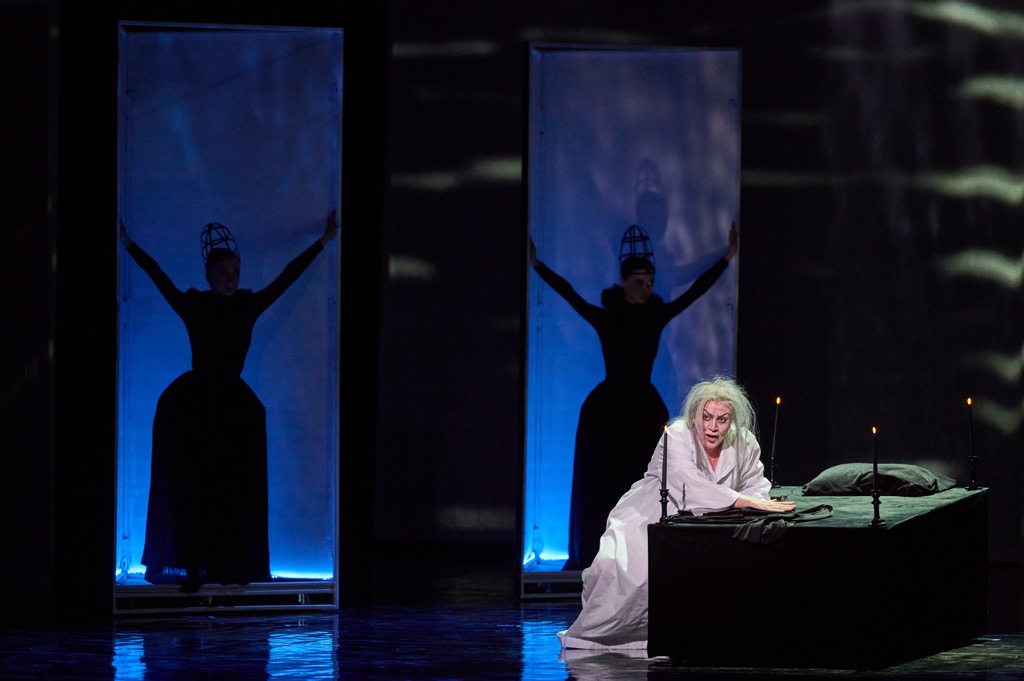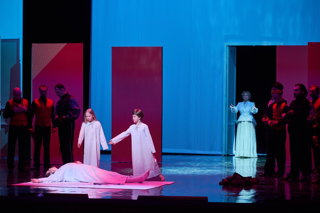 Коробка не замкнута: двери-порталы для связи с внешним миром – на ее торцах, а один на заднике в центре в иные моменты сюжета служит еще и выходом в потусторонний «астрал», куда «уходят» живые, и откуда «возвращаются» мертвые. Сценический реквизит минимален: немного мебели чисто служебного назначения да мобильный гарнитур из ниш-витрин в форме угла. Одна из его граней – зеркально отражающая, фокусирующая на себе зловещие тени и отблески, и этот гарнитур всё время меняет конфигурацию с помощью балетных статистов. Однако самый важный артефакт – кровать-одр, кровать-катафалк с зажженными в углах свечами – возникает в «самой важной» центральной картине оперы (в четвертой, если «забыв» о трех оригинальных актах, считать картины последовательно).