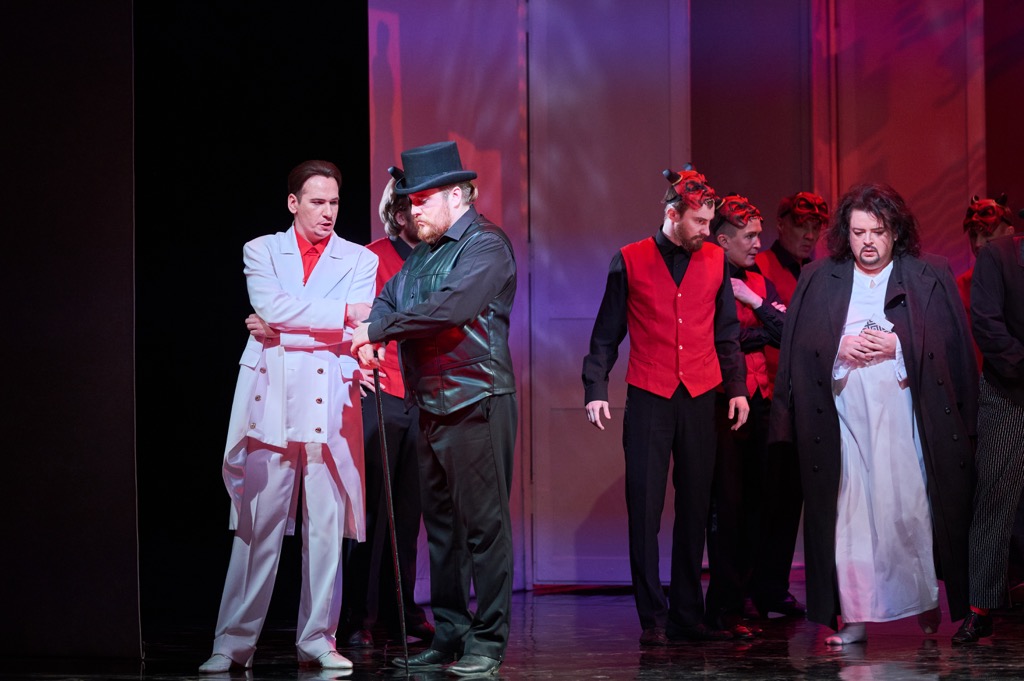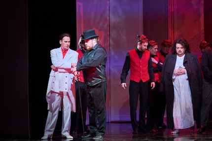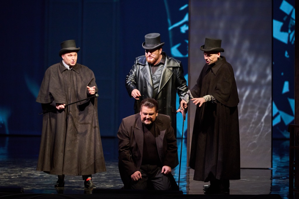 Как говорится, слов из песни не выбросишь, и в финале третьей картины на балу у сановного вельможи хор, естественно, по-прежнему славит Екатерину и ее век, но «тайная недоброжелательность» в ход сюжета вмешивается и на сей раз: вместо императрицы на балу собственной персоной появляется сама Графиня! Ее назойливые видéния буквально преследуют Германа, и драматургии сюжета сей зигзаг не только не противоречит, но и, в известной степени, делает реверанс с еще более зловещей рельефностью. Один из героев черной масти, одноглазый на сей раз Граф Томский, стоит явным особняком: его антураж с «революционно-кожаным» плащом не вписывается даже в более чем условные лекала XIX века, избранные постановкой. Это, скажем так, подобие персонажа-резонёра, персонажа от автора, а в данном случае – персонажа от режиссера. Граф Томский – словно человек из будущего, которому делегирован интеллектуально-психологический нерв драматургии.