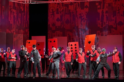 Мир теней и призраков этой постановки – мистическое зазеркалье, существующее по своим, не совместным с реальностью законам, и семь оригинальных оперных картин оперы проходят на сей раз практически нон-стоп, прерываясь на антракт лишь единожды – перед сценой в спальне Графини, смерть которой – еще не финал, но первая знаковая кульминация. Начало каждой новой картины словно стоп-кадром задерживает в пластике финал предыдущей, и «пластическое перетекание» цельность всего действа цементирует, как цельность наэлектризовано-хрустящей твердой карточной колоды в руках банкомёта, которая оказывается, как было отмечено ранее, форменным инструментом дьявола…