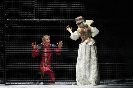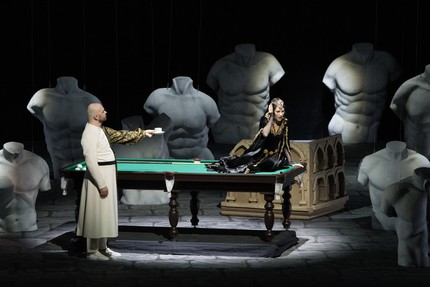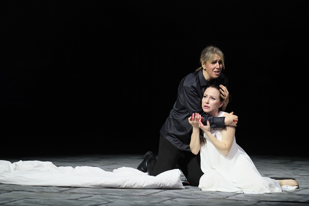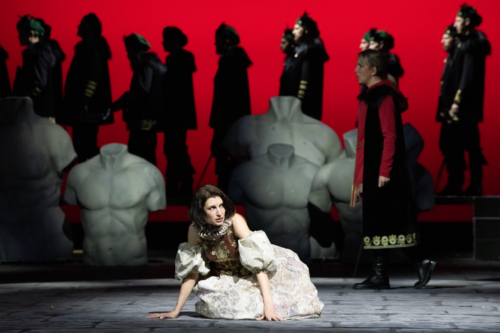 Почему же последнюю сцену Лоренцо с Джульеттой мы назвали «снотворно-ядовой»? Да потому, что сразу же возникает вопрос, было ли это намеренное отравление Джульетты семейным врачом, либо просто случайно как результат врачебной ошибки произошла передозировка? Лоренцо в этой опере всего лишь врач, но на этот раз режиссер, как и у Шекспира, наделяет его функцией духовника Джульетты. Это видно по деталям костюма, стилизующим его под облачение священника, а также по действенной мизансцене в финале первого акта, в которой Джульетта отчаянно противится попытке Тебальда надеть ей на палец обручальное кольцо. Мизансцены спектакля вообще очень понятны, их пластика выразительна, их воздействие на зрителя психологически глубоко даже при внедрении в визуальную ткань «островков» нарочито современного сценографического антуража.