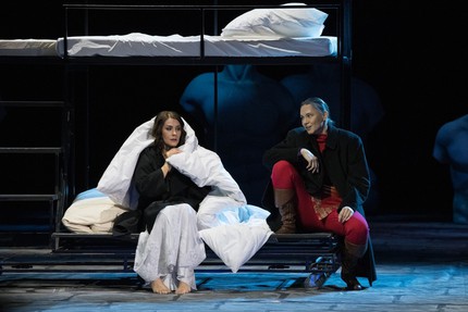 При этом важно подчеркнуть, что хотя упомянутый флагманский проект 2020 года в Москве и был позиционирован как первая в России сценическая постановка этой оперы, лавры подобного рода надо всё-таки отдать Красноярску. В Москве мы ведь имели дело с явно студийным «одноразовым» semi-stage проектом, а на просторах Енисейской Сибири родилась полноценная постановка, вошедшая в репертуар стационарного театра. Сам театр, в свою очередь, приобрел фирменную продукцию в духе модной по нынешним временам эклектики, легко и свободно смешивающей традиции и современность, эпохи и стили, элементы реализма и реалистичной абстракции. Но эта постановка не только не заходит за грань сюрреализма, но создает вполне романтическую атмосферу! Понятно, не по лекалам романтического XIX века, в котором эта опера Беллини впервые увидела свет (1830), а по нынешним меркам, всегда «заостряющим» природную романтику бельканто в визуальном аспекте и не всегда оставляющим надежду на совместимость с аспектом чисто вокальным.