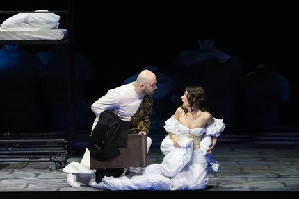 В переменчивый узор сюжетного действа они не вписываются лишь на первый взгляд, но на сáмом деле в общую фактуру театрально-сценического действа они встраиваются потрясающе органично, оригинально и, пожалуй, даже элегантно, с эстетически тонким и рельефно действенным вкусом, художественная самодостаточность которого не вызывает никаких сомнений. На сей раз режиссерско-сценографический перпендикуляр к музыке (вспомним формулу «патриарха» отечественной оперной режиссуры Бориса Покровского) выстроен продуманно и цельно, а в заданном режиссером «коридоре эпох» всё предельно отлажено с целью высветить трагедию двух любящих сердец на фоне глобальной трагедии междоусобной войны и бесконечных кровопролитий…