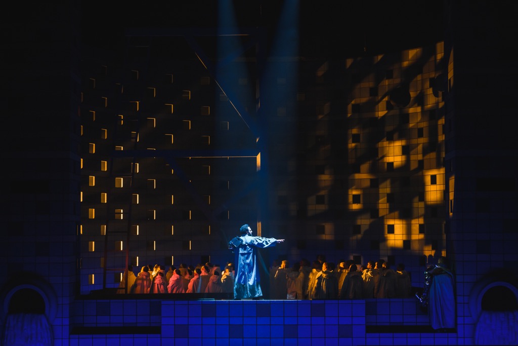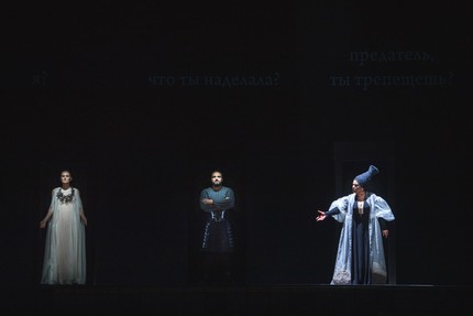 Ведь откровенно статуарный, с минимумом движения, графически выстроенный на абстрактных символах спектакль от эстетики semi-stage уходит недалеко. Но главное, что эстетике оперы бельканто это лишь играет на руку! Да и мысль о спектакле-комиксе вовсе не голословна: на этот раз перед взором зрителя – не просто строка традиционных супратитров русского перевода, а череда сценических зон проекционного текста. И пока корабль-ковчег прокладывает свой театральный курс, эти зоны то здесь, то там возникают в разных мультимедийных формах на разных участках поверхностей, обращенных к залу.