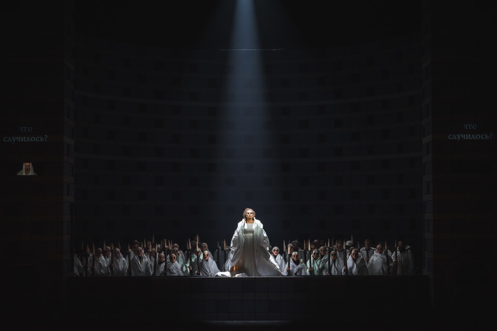 А посему, временно уходя от проблематики бельканто, сосредоточимся собственно на постановке как на театральной продукции. Постановочная команда проекта необычна уже тем, что режиссером выступил профессиональный балетмейстер, и в качестве такового на сей раз предстал Максим Петров. Его постановочное видение двухактной итальянской истории либреттиста Феличе Романи, создавшего ее на основе одноименной пятиактной французской трагедии Александра Сумé, зиждется на абсолютно абстрактной графической эстетике серьезного комикса. В его визуальный ряд режиссер-балетмейстер (к счастью, дозированно и ненавязчиво!) включает еще и элементы «загадочной» пластики. Но смысл ее, как и смысл всех символов спектакля, к которым приложили руку сценограф Альона Пикалова, художник по костюмам Ирэна Белоусова и художник по свету Константин Бинкин, лишь этой когорте творцов-единомышленников по-хорошему и понятен…