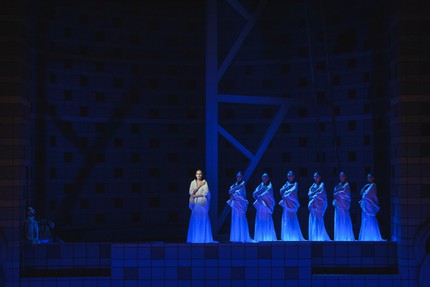 Сценография, неизменная на оба акта оперы, и впрямь похожа на постмодернистскую конструкцию футуристического корабля. По флангам сцены во всю ее высоту взметнулись башни-трубы: на каждой – прорезь-окошко посредине и стоковый «иллюминатор» внизу с застывшей (вытекающей из него) бутафорской водой. Между башнями-трубами – подиум палубы, а за ней – вмещающий объем корабля, ограниченный до колосников сцены стеной-полусферой с окошками-«бойницами». Корабль-«кит» словно уплывает от нас, а плавные «носовые» его очертания и внутренняя реечная веха (друидский алтарь) по ходу дела то закрываются черной ширмой, то открываются. Теперь лесное царство друидов – ковчег, куда пробираются римляне Поллион и его друг Флавий, и придуманный мир обитателей ковчега, раздираемый согласно либретто Романи внутренними противоречиями, как серый и мрачный субстрат для произрастания света бельканто оказывается вполне подходящим.