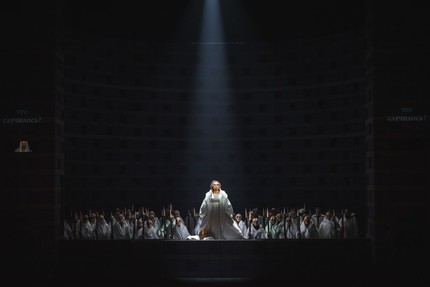 В то, что в этом проекте обошлось без такового, не верится даже после просмотра спектакля, но факт остается фактом! На этот раз мудрая Норма, прощая Адальджизу и вверяя прижитых с Поллионом детей своему отцу Оровезу, стоящему во главе друидов, восходит на костер безо всякой надуманности. Искупительная жертва приносится именно таким образом, и Поллиону, печальная участь которого в священном стане друидов всё равно предрешена, в лучших романтических традициях не остается ничего иного, как взойти на костер вместе с Нормой. Поллион, ясно сознавая величие любви к своей первой пассии, конечно же, поражен актом ее самопожертвования и справедливостью, ведь после греха Нормы грех Адальджизы выглядит лишь мелкой шалостью, да и то «неудавшейся»…