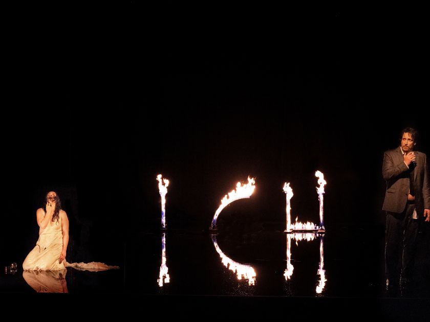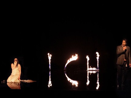 Одной из наиболее знаковых цитат стала отсылка к творчеству Билла Виолы, выставка работ которого проходит в эти дни в зальцбургском Музее современности впервые в Австрии: идея очищения человеческой психики водой и огнём вырастает из мрачной трёхмерной сценографии. В этот раз Кастеллуччи не просто замуровывает живописные арки Скальной школы верховой езды, как в «Саломее» (2018) — он погружает всё действие оперы Бартока-Балаша в полыхающе-рыдающий мрак, в котором певцы сливаются со стихиями огня и воды как с истоками вечности.