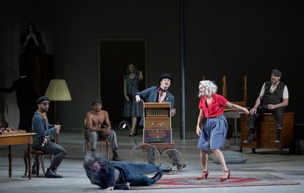 В новой композиции К. Лоя «Триптих» открывается плутовской комедией «Джанни Скикки», в которой «мерцание мизансцен», когда скульптурные ансамбли персонажей будто случайно вырастают из хаотичного движения, на мгновение замирают, а потом снова рассыпаются, создаёт эталонную для сатирического шоу мизансценную палитру. Кремовый минимализм сценографии Этьена Плю здесь безупречен. Комические акценты подчёркнуто элегантны и ни разу не срываются в пошлость. Феерическая россыпь музыкальных пассажей в оркестровой яме переливается легким остроумием, а ансамбль солистов вызывает восторг.