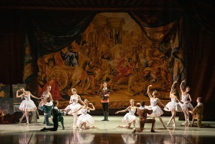 Этому во многом способствовал и четко попавший в десятку заветной творческой цели подбор постановочной команды. В нее вошли сценограф-поставновщик Альона Пикалова и художник по костюмам Елена Зайцева при участии художника по свету Руслана Майорова и автора видеопроекционного контента Ирины Синельниковой. Консультантом постановки стал Юрий Бурлака, в последние годы выделившийся в отечественном балетном тренде как специалист по историческим реконструкциям. Но самое главное, что в условиях утраты партитуры (сохранился лишь небольшой фрагмент скрипичного репетитора) музыку, как бы парадоксально это ни звучало, по заданию хореографов-постановщиков, выстроивших новую музыкальную драматургию и разработавших собственную редакцию либретто, фактически заново написал Петр Поспелов, ангажированный в качестве композитора.