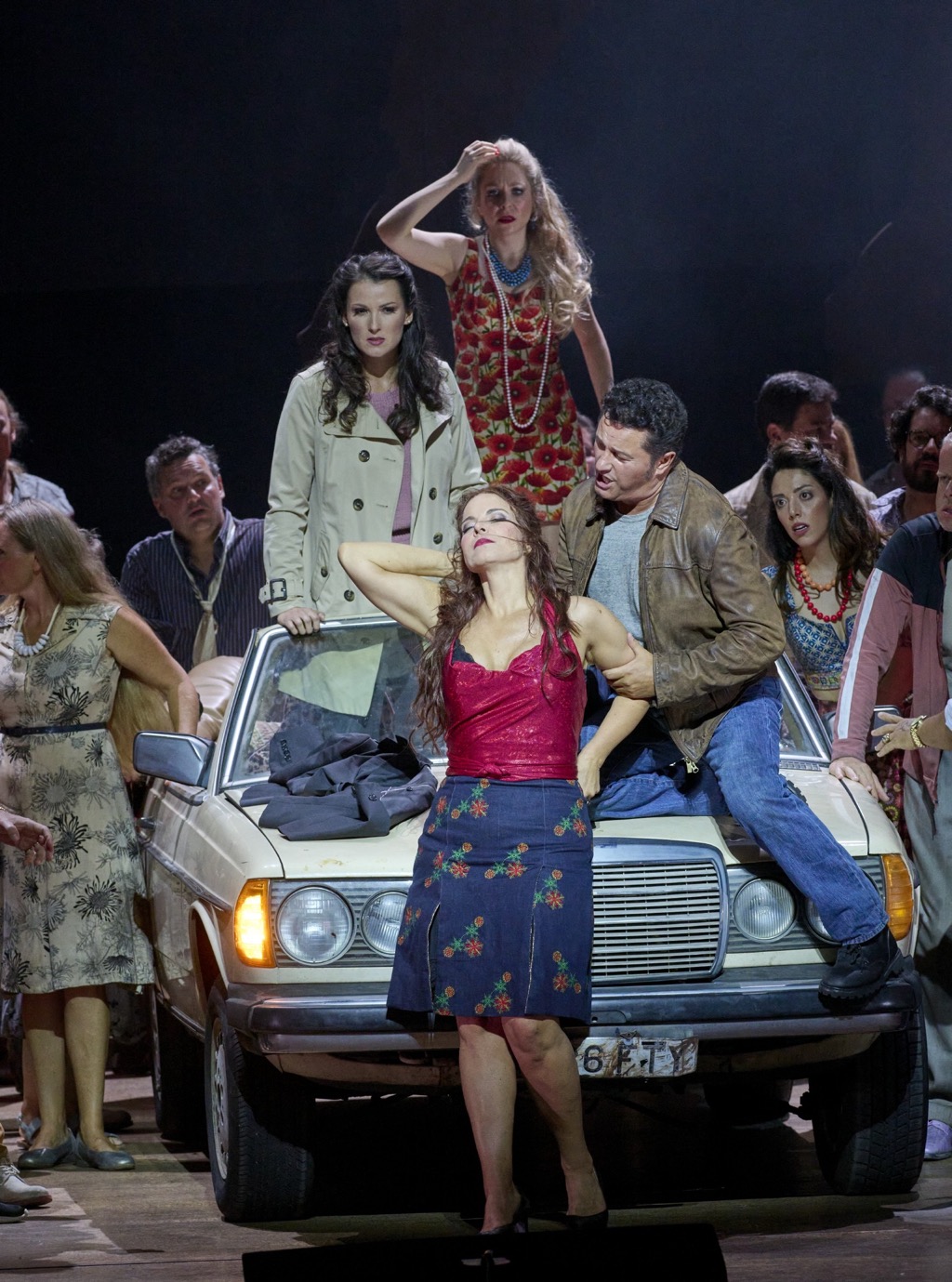 Конечно, нас не радует то, что подруга Кармен Фраскита появляется на сцене, вываливаясь с бутылкой на ходу из старого сигналящего «Мерседеса», а её коллега Мерседес на глазах своей дочери пытается отделаться от сексуальных приставаний Моралеса, раздевшегося до красных трусов-стрингов. Но то, как изумительно чисто и сочно звучат при этом участницы этой изуверски сложной сцены Мария Назарова и Изабель Синьоре, не может не восхищать! Певицы создают драматически самодостаточный дуэт заклятых подруг в сопровождении темнокожего господина в белой тройке, который символизирует невидимую, но продекларированную связь между любовной страстью и смертью.