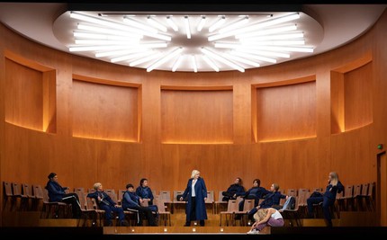 Эти страхи богини легко понять. Причём именно в интерпретации Чернякова понять их намного легче, чем в любой другой. Единственное, чего, на мой взгляд, не хватает этому спектаклю, — это динамики. Особенно в финале, когда появляются валькирии в образе спецкоманды, отбирающей подопытных для наблюдения в Департаменте насилия при Экспериментальном научном центре человеческой эволюции (E.S.C.H.E. [3]). Здесь, конечно, всё логично, но красочной визуализации недостаёт. И даже сильная и глубоко философская сцена, когда Вотан ради сохранения власти предаёт свою любимую дочь Брунгильду (Аня Кампе), оставляя её одну в чёрной пустоте без света, цвета и огня, не оправдывает, на мой вкус, драматического проседания финала.