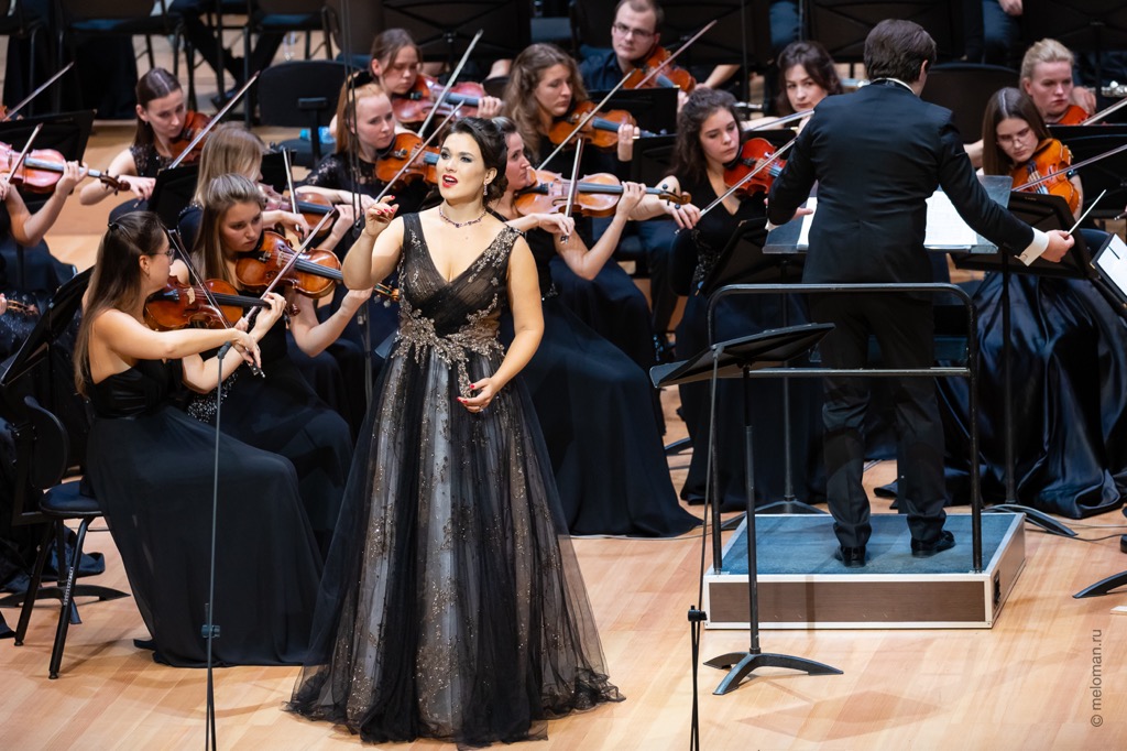 Так что в зале в этот вечер был явный аншлаг и царил восторженный прием публики – меломанов не проведешь! Во всех оперно-оркестровых вечерах с участием солистов, ради которых мы и спешим занять место в зрительном зале, каждый раз приходится «заодно» внимать и «разбавляющим арии» оркестровым связкам (в основном, оперным увертюрам, но не только). В части такого сопутствующего материала на этот раз прозвучали увертюры к операм «Сила судьбы» Верди и «Сорока-воровка» Россини, «Вакханалия» из оперы Сен-Санса «Самсон и Далила» и «Фарандола» из музыки Бизе к драме Доде́ «Арлезианка».