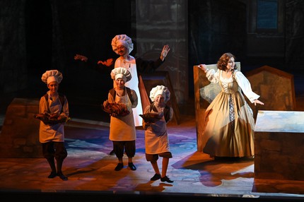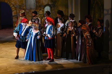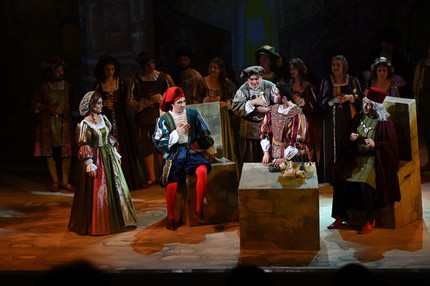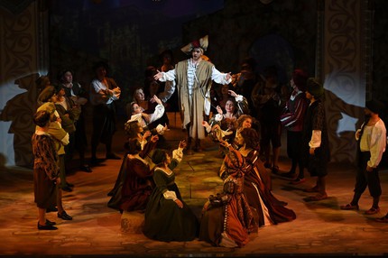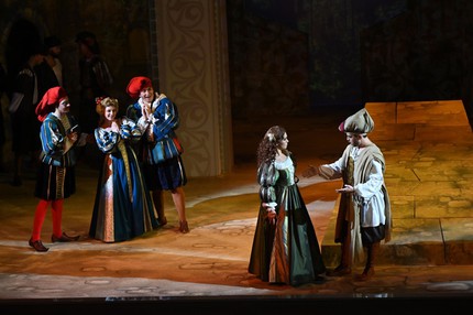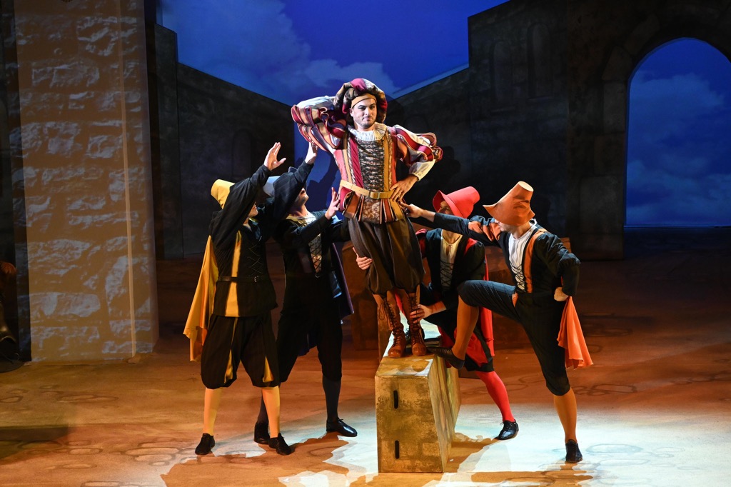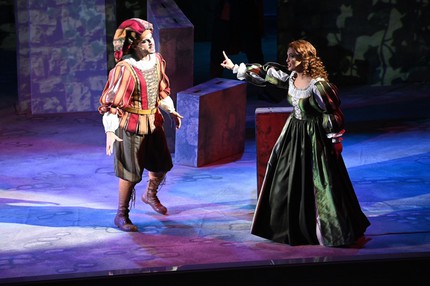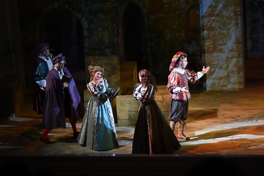 Действие оперы разворачивается в Падуе, и для воссоздания итальянской атмосферы эпохи Ренессанса элементы «колонно-балконного» архитектурного ордера Малого зала, распространяющегося и на саму сцену, достаточно было лишь «подстроить» под антураж живописно-зрелищной театральной оболочки. А ее наполнение действенно оживало за счет продуманных мизансцен и эффектной пластики героев, стилизованных «под эпоху» костюмов и блестящей актерской игры всего ансамбля персонажей – от слуг до господ, от второстепенных участников комедийного действа до главных. И скрупулезная работа режиссера с актерами в этой классической постановке привела к впечатляющим результатам!