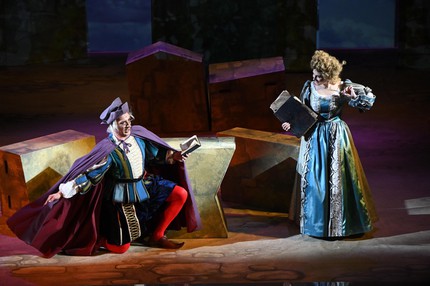 «Подстройка» сценографии осуществлена с помощью «урбанистических выгородок» на заднем плане, искусной постановки света в сочетании с видеопроекционной графикой, превратившей белые поверхности прямоугольных колонн в элементы каменных средневековых построек. «Подстройка» осуществлена и с помощью элегантно накинутых на балюстраду балкона шпалер-драпировок, и с помощью приема разбросанных по сцене «камней», на самом деле, конструкций, напоминающих каменные артефакты искусственно-рукотворной формы, которые постоянно переставляются на сцене, как детали конструктора, и могут служить чем угодно — хоть подиумом, хоть подставкой, хоть столом, хоть стулом…